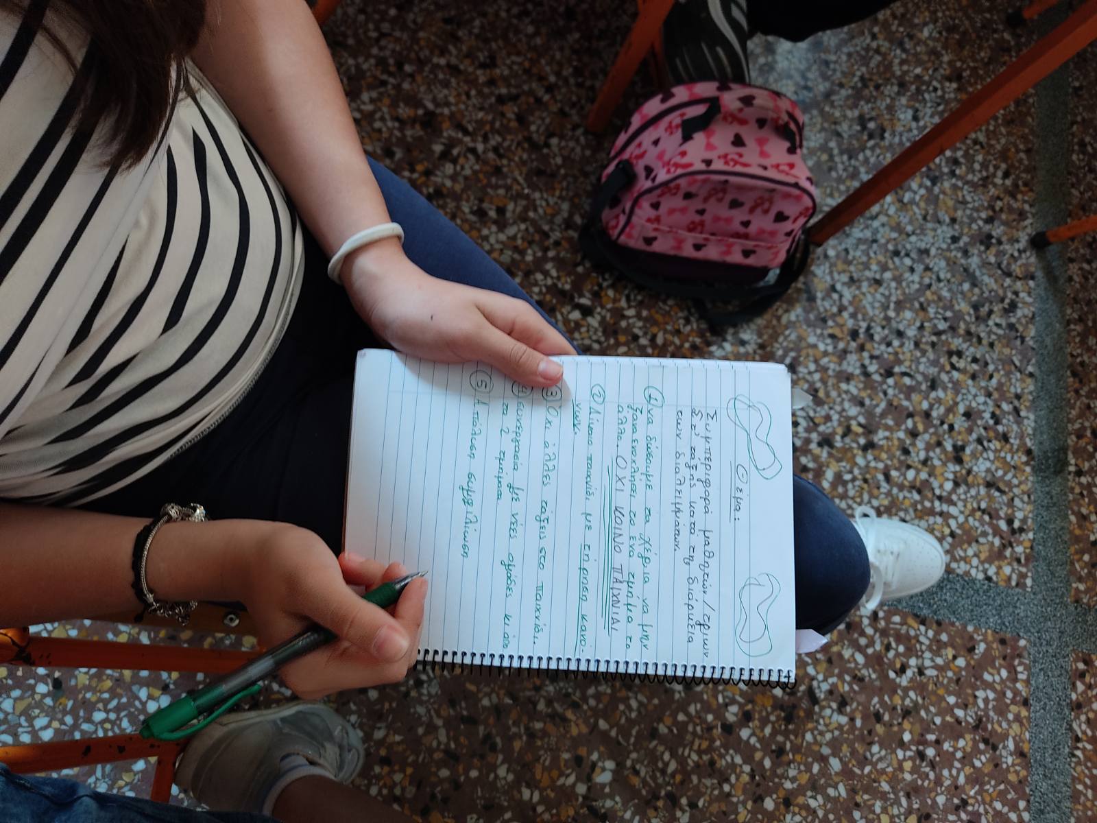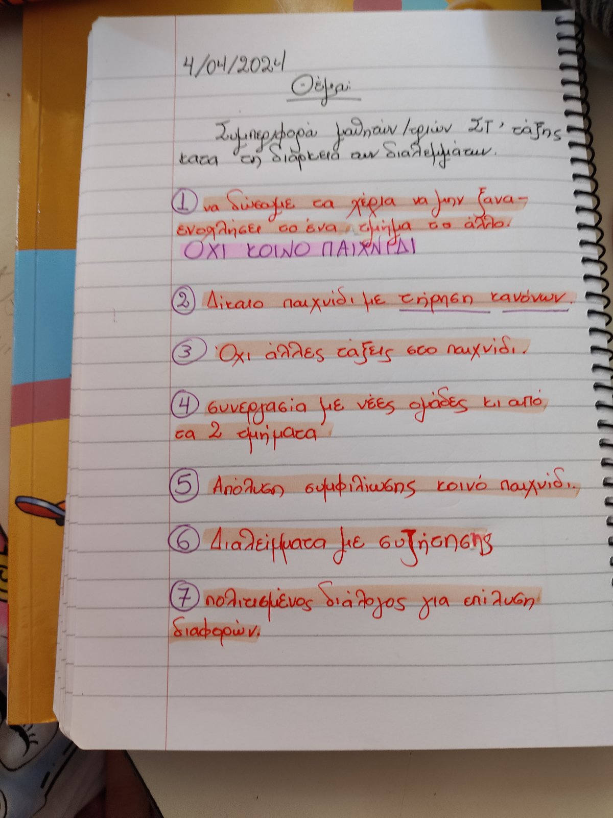 Το θέμα που συζητήθηκε διαλογικά ήταν “Συμπεριφορά κατά τη διάρκεια των διαλειμμάτων“. Δόθηκαν προτάσεις από τα ίδια τα παιδιά (8, συγκεκριμένα), καταγράφηκαν, έπειτα ψηφίστηκαν με ανάταση χειρός και το αποτέλεσμα ήταν 30 ψήφοι υπέρ του ήρεμου παιχνιδιού, με κανόνες και τήρησή τους, έγινε αναπαράσταση του σωστού τρόπου που παίζουμε, αναπαράσταση του λανθασμένου τρόπου (προς αποφυγήν) κρατήθηκαν σημειώσεις από τη διαδικασία και όλοι έδωσαν τα χέρια, συμφωνώντας στο ότι το παιχνίδι είναι για να περνάμε όμορφα. Συζητήθηκε, επίσης, ότι όλοι είμαστε φίλοι κι αν κάποια στιγμή επέλθει η ήττα στο παιχνίδι και την αποδεχτούμε πολιτισμένα, αυτό είναι μεγάλη ΝΙΚΗ, γιατί κερδίζουμε τους φίλους μας για πάντα!!!!