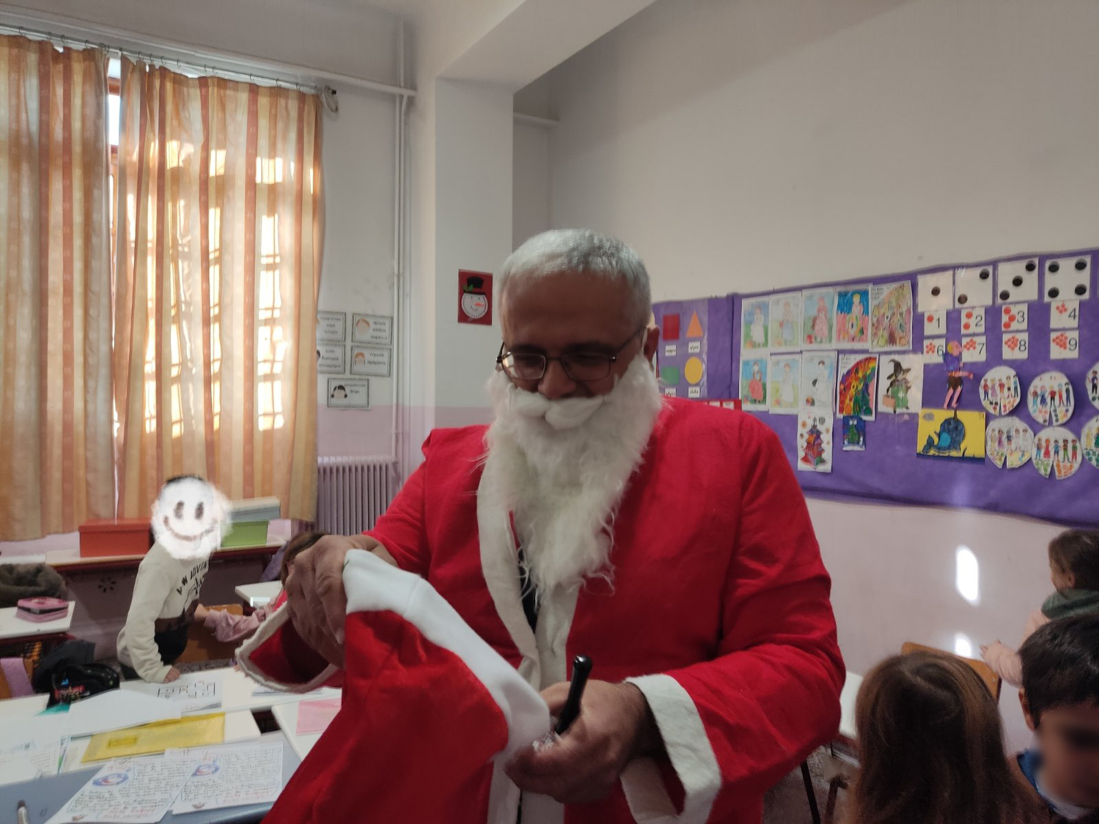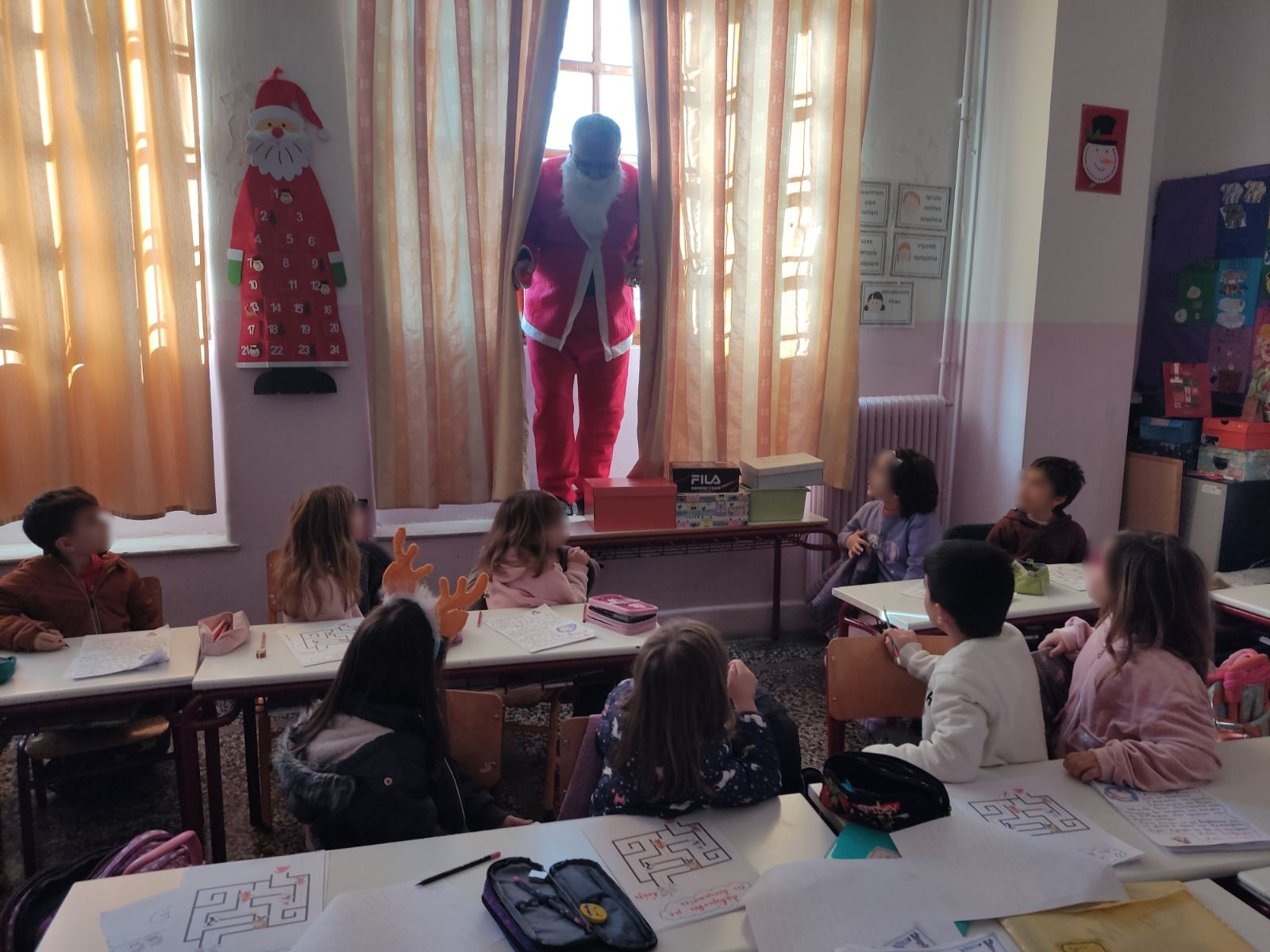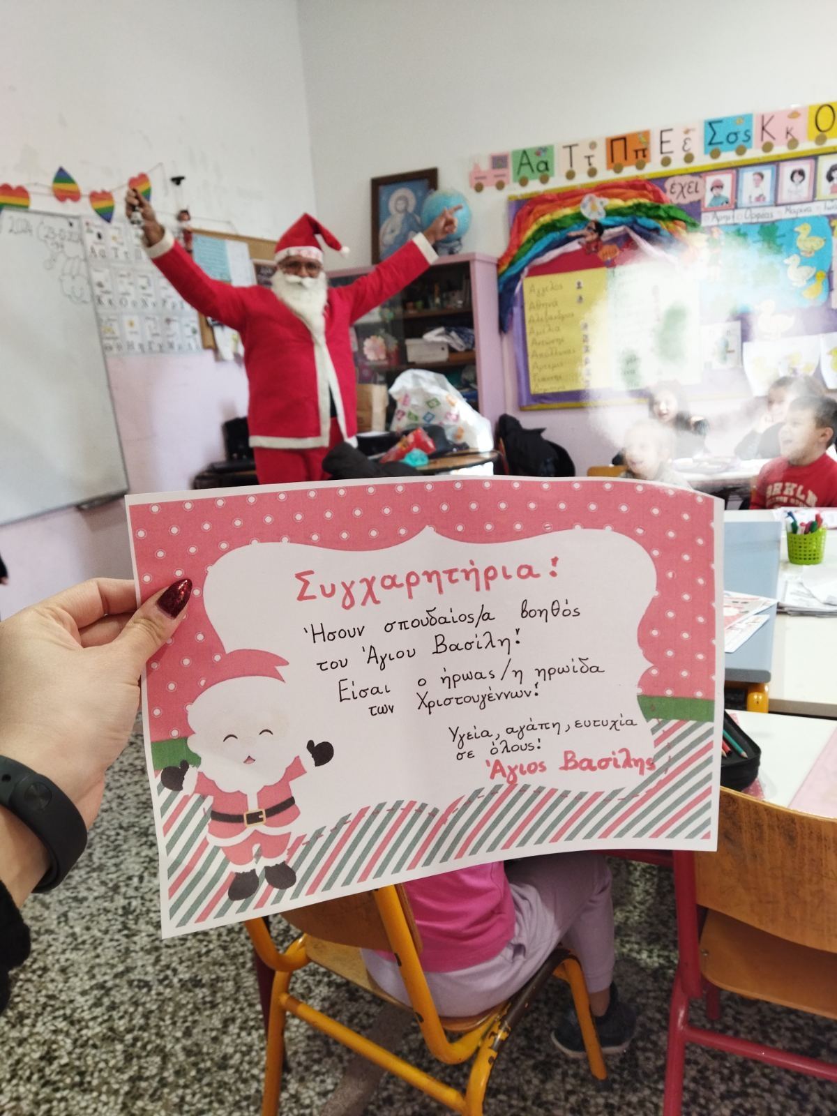 Ο ξεσκούφωτος Άγιος Βασίλης ξεπρόβαλε αναπάντεχα από την κουρτίνα του παραθύρου της Α’ τάξης και παρέλαβε τον σκούφο του. Η χαρά και η περηφάνια των παιδιών ήταν απερίγραπτη!!! Ο Άγιος τα αντάμειψε με το βραβείο του ήρωα των Χριστουγέννων!!!